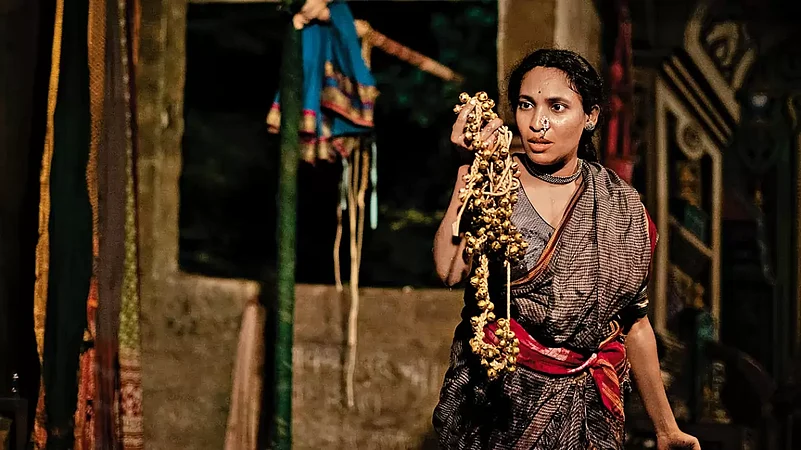 The verse describes a young girl dreaming of becoming a celebrated laavani dancer. Her story unfolds in a room inside ‘The Unnamed Building’ where she plays out her miseries and fantasies aloud in a dream loop, the stagnant straw mat of her dreary present offsetting the kinetic potential of her shiny ghungroos. The audience watches the pathos, entranced. Somewhere else, the tension is broken by an avaricious financial advisor singing an ode to wealth. In another room, a real-life poet recites her fiesty anti-establishment poetry to stir the mood and in yet another, a queer dancer sings softly, seeking their identity.