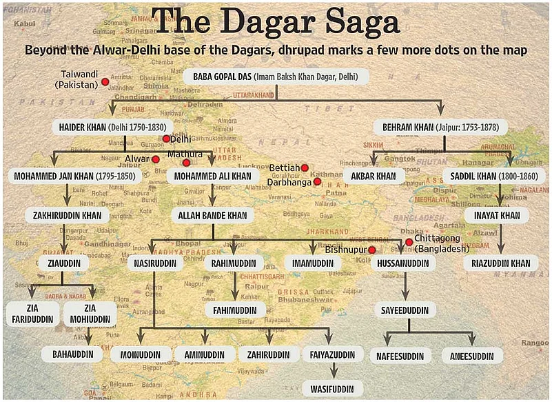 Sayeeduddin is now entombed in Jaipur, where he spent life till middle age before moving to Pune in 1984. Two of his sons are keen to carry forward the legacy. “We used to be so restless as little boys when father would pin us down to long hours of riyaz (practice),” recalls Nafeesuddin, mourning alongside Aneesuddin. The tanpura’s drone, though, was gripping. The duo debuted in 1999 at their ancestral house in Jaipur—named after the baani’s real founder, Behram Khan Dagar (1753-1852), son of Gopal Das (later Imam Baksh Khan).