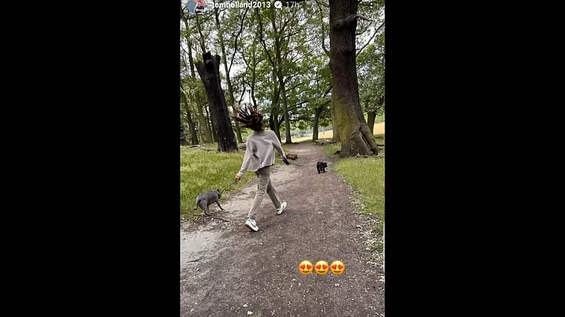 In the next picture, the 'Dune' actress was seen walking through a forest along with her pets. She was in a grey top, matching pants and white sneakers. Tom sharing the picture added heart-eye emojis.