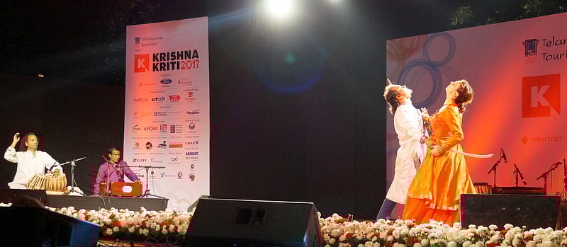 The concert at Rock Heights—one of the seven locations of the 14th edition of the four-day festival being organised by Telangana Tourism—was preceded by an hour-long choreographic piece by Maude and Co led by a Kathak practitioner from France. Titled ‘Dance of the Peacock’, the show led by the young European, also given the name Manjushree Pradhan, saw the stage being shared by actor-dancer Rajiv Sohore besides a small team of musician-instrumentalists.