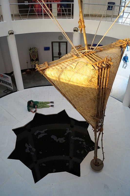 “I got just three days to put up my work. It was anyway site-specific, I knew—so I did have some idea of the shape,” says the globe-trotting artiste, who otherwise lives in his native Pattiam village of Kannur district in north Malabar. “The canes and bamboo-poles used here are local. I have named my installation ‘Hiccups of the Earth’,” he adds, with an impish smile, pointing to the star-shaped blackish-blue water-body that works as a reflector of the installation.