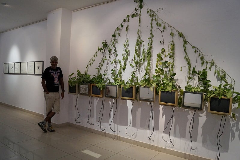 The weakening closeness to nature in a tech-driven era becomes the focal theme in another work upstairs, where Delhiite Mukesh Sharma has put up an installation named Botanic Monomania.” My current display work is an attempt to create a synthesis of my experiences of technology with my surroundings those of my past with those of my present,” notes the 42-year-old artist who was raised in Doroli off Alwar in eastern Rajasthan, referring also to his newest work, which is a collection of nine junk computer monitors with severed tops from where sprout money plants.