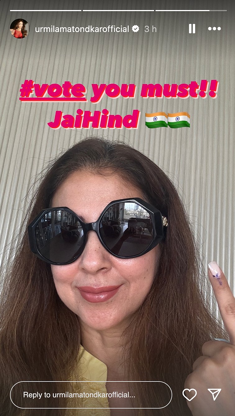 Former actress Urmila Matondkar, who contested for the Mumbai North seat on a Congress ticket in 2019, also exercised her right to vote on Monday. The actress took to the Stories section of her Instagram and shared a picture of herself.