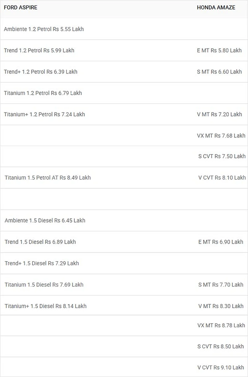 Ford has launched the 2018 Aspire in India at Rs 5.55 lakh (ex-showroom India). The sub-4m sedan now renews its rivalry with the likes of the Honda Amaze, Maruti Dzire, Hyundai Xcent, Tata Tigor and Volkswagen Ameo. While we have already done the variants explained of the new sedan, it is time pit its variants against the similarly priced variants of the other sub-compact sedans, starting with the Honda Amaze.