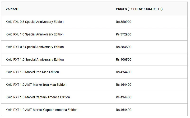 Renault also offers a few other variants in the form of Special Anniversary (available in both 0.8L and 1.0L configurations) and Marvel editions as well but since these are limited period variants, these are not a part of this story. Here are the prices of these variants: