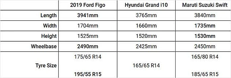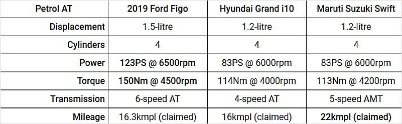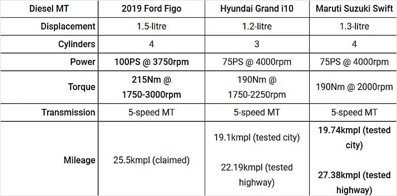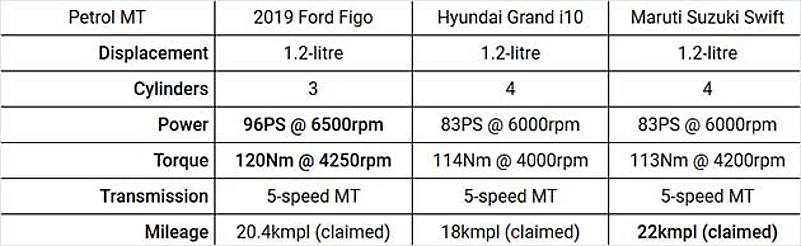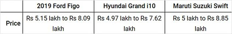 Ford has launched the new Figo facelift at prices ranging from Rs 5.15 lakh to Rs 8.05 lakh (ex-showroom Delhi). Apart from the cosmetic changes inside out, the 2019 Figo now gets two new petrol engines, new manual transmission and some new equipment too. Here’s how it compares to its main rivals in the segment - the Maruti Suzuki Swift and the Hyundai Grand i10 - on paper.