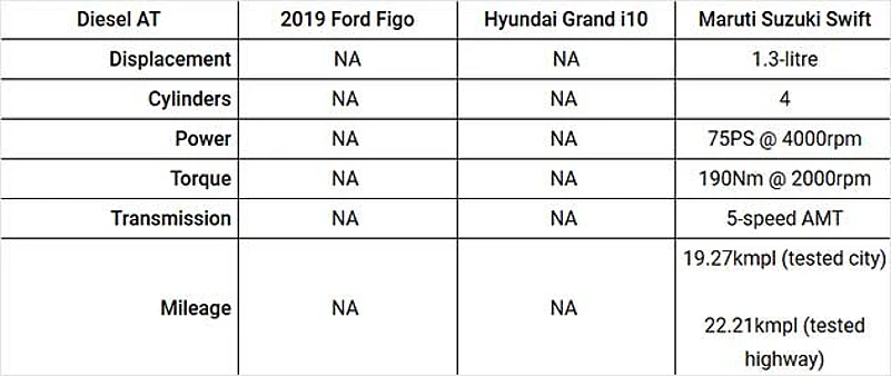 The Maruti Suzuki Swift has the advantage of being the only car in the class to offer a diesel-AT variant. While it may seem like Ford has missed a trick by not offering an automatic variant with its brilliant diesel engine, it makes sense when you consider the fact that the popularity of diesel cars is expected to nosedive very soon anyway.