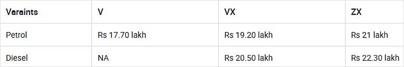 Price- Rs 19.20 lakh (Petrol)/ Rs 20.50 lakh (Diesel) (both ex-showroom India)