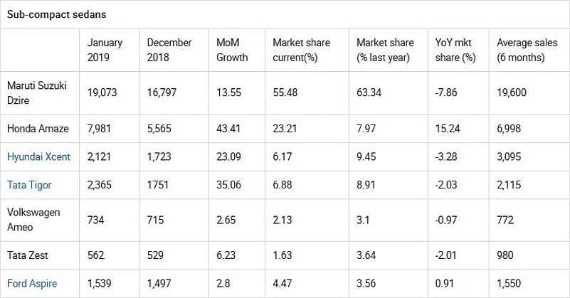 Amaze builds on incredible performance: The Amaze has been doing well in recent months and and though December 2018 saw a negative month-on-month growth, the January 2019 figures suggest that it was only because buyers wanted to wait till 2019 to get the current year’s model. While it is no way near to catching up with the Dzire, the numbers do tell an impressive story.