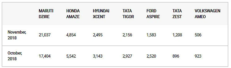 The Dzire’s way ahead of the curve while the Amaze is nestled at the second spot with little threat from the Xcent, which clocked half as many sales as the Honda. Although the Xcent and the Tata Tigor were neck and neck in October, with a difference of just 216 units in favor of the Hyundai, that gap increased to 339 units in November.