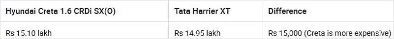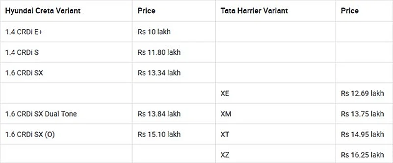Let’s first take a look at the price of different variants of the Creta and Harrier and see which variants of the two are priced close together.