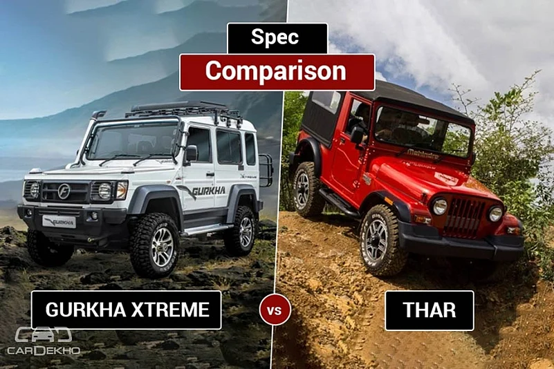 Force Motors recently introduced a more powerful variant of the Gurkha SUV -- the Xtreme. It is more powerful, bigger and gets better off-roading equipment (on paper) than the Gurkha Xplorer. We have already compared the Gurkha Xtreme with its sibling, the Xplorer, here. And now, we find out how it fares against its arch-rival, the Thar CRDe on paper.