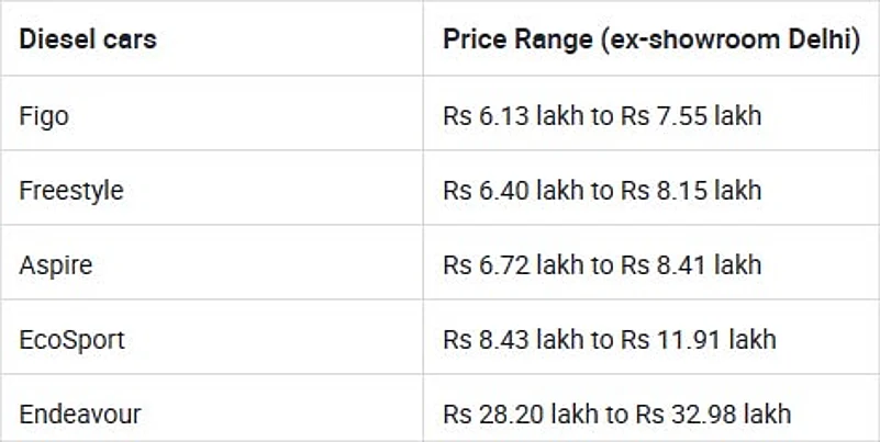 Prices of the current Ford diesels range between Rs 6.13 lakh and Rs 32.98 lakh.