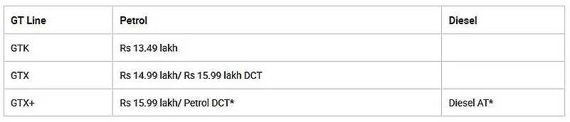 Kia hasn’t revealed the prices of the range topping GTX+ 1.4-litre-DCT and diesel-auto options yet. Currently, the most feature loaded GTX+ trim is only available with the 1.4-litre engine and a manual gearbox. While Kia is yet to announce the prices of the said variants, dealers are accepting bookings for the same. These are the current introductory prices of the GT-Line variants: