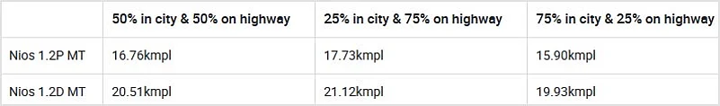 The diesel-engined variant delivers an extra 4kmpl over the petrol-engined variant on average. When driven predominantly in city traffic, the Nios’ mileage is just under 16kmpl for the petrol and just under 20kmpl for the diesel. However, if your commute involves more highway driving than in the city, you can expect a mileage of well over 17kmpl from the petrol Nios and over 21kmpl in the diesel.