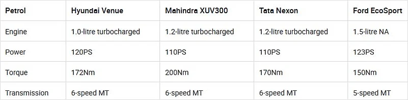 Except for the EcoSport, all three SUVs here come with turbocharged petrol engines. The Ford gets the highest capacity engine that also happens to be the most powerful of the lot. When it comes to torque, the Mahindra takes the lead with 200Nm, which is 28Nm more than its closest rival, the Venue, which makes 172Nm. The EcoSport’s 1.5-litre petrol unit makes the least torque here.