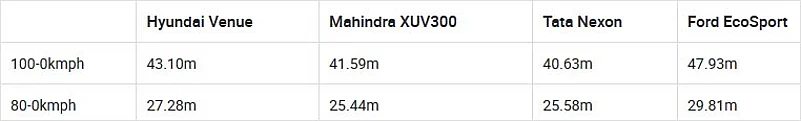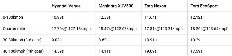 Thanks to its 1.0-litre direct-injection turbocharged unit, the Venue is quickest to hit the 100kmph mark. It completed the run in 10.99s, 0.65s less than the Nexon, which takes the second spot. The XUV300 despite making the highest torque comes last, behind the EcoSport which completed the run in 12.12s.