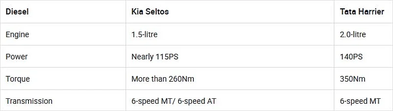 Where the Seltos comes with a choice of petrol and diesel engines with a total of four transmissions, the Harrier is only present with a 2.0-litre diesel engine with a 6-speed MT. An automatic Tata Harrier isn’t far though. Let’s look at how the diesel engines of the two SUVs compare though.