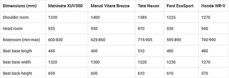 Mahindra XUV300 and Ford EcoSport get generous front row space followed by the WR-V and Nexon, which are closely matched.