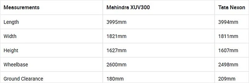 Talking of dimensions, the XUV300 comes out on top on all fronts but one. The XUV300 is longer by just 1mm. However, it is wider by 10m, taller by 20mm and has a substantially longer wheelbase by 102mm. It is only in the case of ground clearance where the Nexon comes out on top (+29mm).