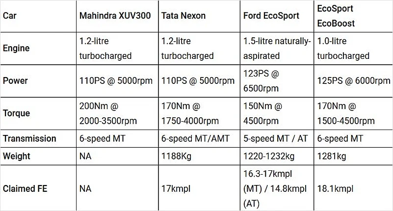 Out of the lot, the car with the tiniest engine - the EcoSport EcoBoost - stands out as the more powerful. While it is the smallest engine here, the turbocharger helps it make the most horsepower. Although both the XUV300 and the Nexon are turbocharged, they get a more relaxed state of tune. They both make 110PS of power but the XUV300 wins the torque battle, putting out 200Nm. The 1.5-litre Dragon engine in the Ecosport is a 3-cylinder naturally-aspirated unit and makes the least amount of torque at 150Nm.