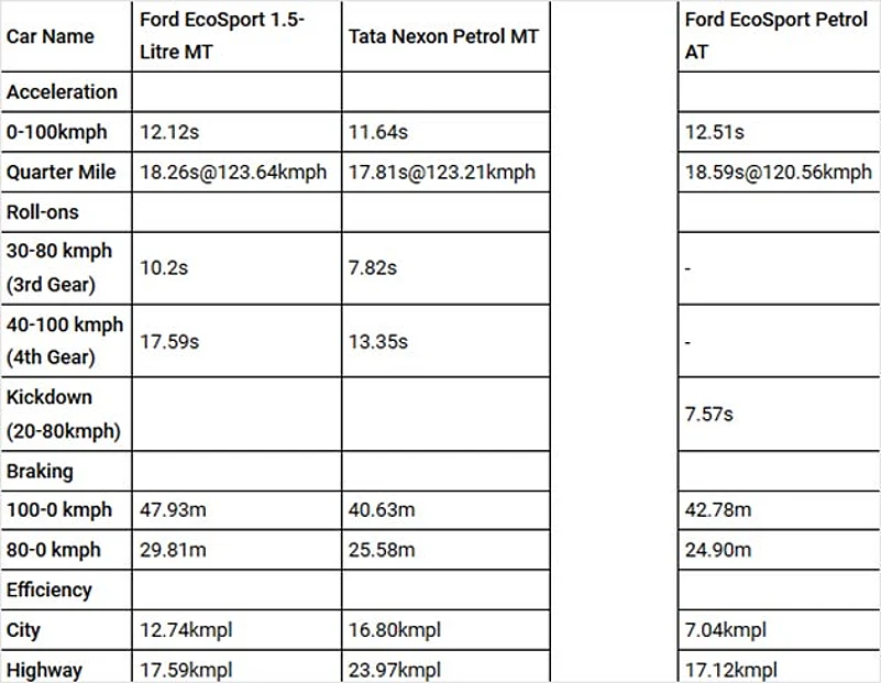 Now, it's time to compare the real-world performance. Out of the lot, we have tested the EcoSport 1.5-litre MT and AT as well as the Nexon MT. Here’s how they fared.