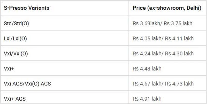 Here’s the full variant wise price list for the new Maruti Suzuki S-Presso: