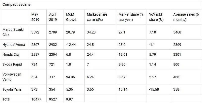 Ciaz leads segment sales in May by a considerable margin: The top spot in the compact sedan segment is a highly contested one between three sedans -- Maruti Suzuki Ciaz, Hyundai Verna and Honda City. Many a times we’ve seen sales of the top three cars separated by not more than three-digit numbers, but the Ciaz led the segment in May 2019 with a significant margin of over 1000 units over the Verna.