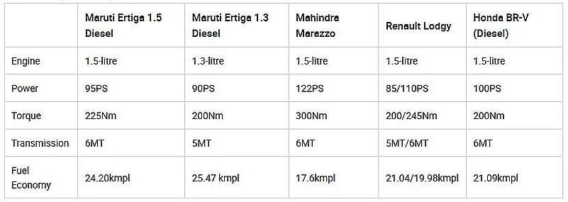 So let’s compare how the new diesel engine on the Ertiga compares with older unit as well as other 1.5-litre engines that power similarly priced people movers in the country, shall we?