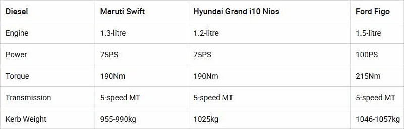 Hyundai recently launched the Grand i10 Nios at Rs 4.99 lakh (ex-showroom, Delhi) to take on the likes of the Maruti Swift, Maruti Ignis, Ford Figo and the Nissan Micra. While the demand for diesel cars are projected to fall once BS6 emission norms take effect, there continues to be buyers out there who prefer their frugal nature. So, we set out to compare the diesel-manual variant of the Hyundai Grand i10 Nios against the Maruti Swift and Ford Figo.