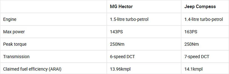 Your experience may vary from ours as fuel efficiency differs with driving conditions, car condition and driving style. If you own either a MG Hector or Jeep Compass petrol-automatic, do share your findings with us and other owners/interested buyers in the comments section below.