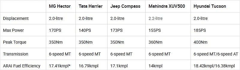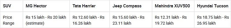 The Hector’s price range given in the table is an estimate as the SUV has not yet been launched yet. If the estimated prices are right, the Hector will operate in the middle of the segment. The Harrier and XUV500 operate towards the start of the segment, while the Compass and Tucson sit at the top-end of the range.