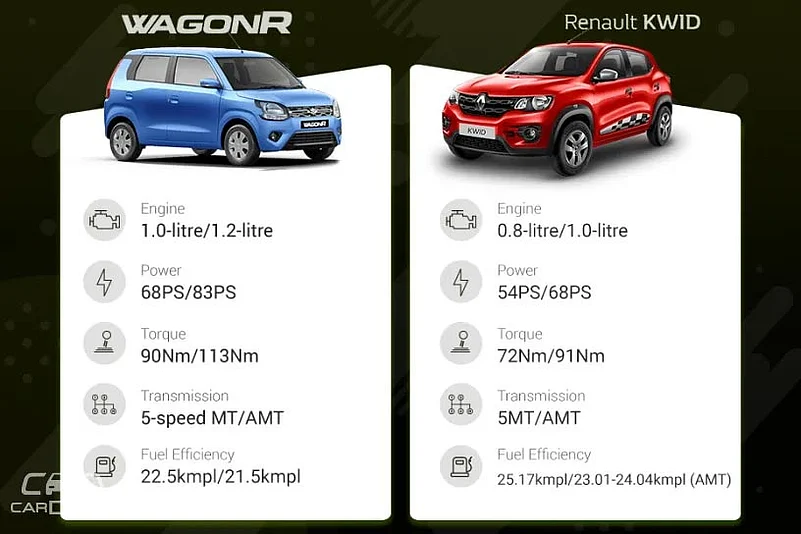 Both models are offered with two engine options. In the Kwid, both the 0.8-litre and 1.0-litre engines are 3-cylinder units while the new Wagon R comes with a 3-cylinder (1.0-litre) as well as a 4-cylinder engine (1.2-litre).
