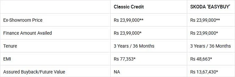 Skoda is offering the EasyBuy scheme exclusively through Skoda Finance Services. The carmaker claims that under this scheme the EMIs for the three-year tenure will be around 40 per cent less (Rs 30,000) than any other conventional loan scheme. Customers can avail up to 100 per cent finance.