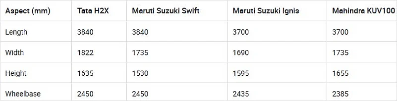It’s interesting to note that the H2X has an identical length and wheelbase as the Maruti Swift. It is the widest among all but is 20mm shorter than the KUV100. On the inside, we expect it to be a tiny bit more spacious than its rivals. The Tata H2X is going to be the second product from the Tata stable to be based on the ALFA ARC architecture after the the Altroz hatchback.