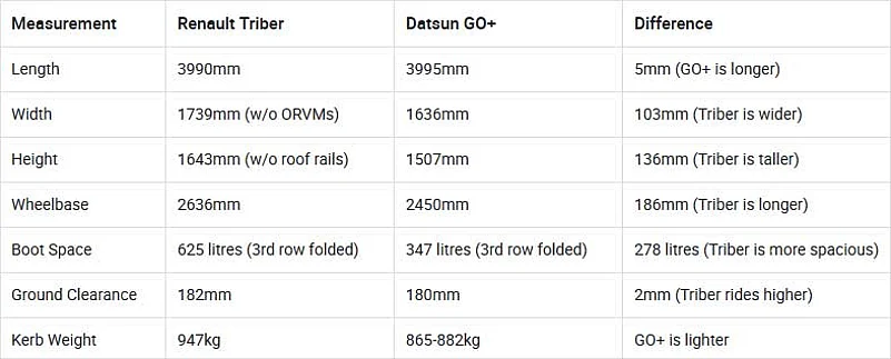 While the Datsun GO+ is longer overall and lighter in weight, the Renault Triber trumps it in all other dimensions.