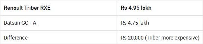 What Triber RXE offers over GO+ A: Digital LED instrument cluster, manual AC, 60:40 split folding middle row with slide and recline, removable third row seats with tumble function, front passenger seatbelt reminder and driver seatbelt with pretensioner and load limiter, projector headlamps.