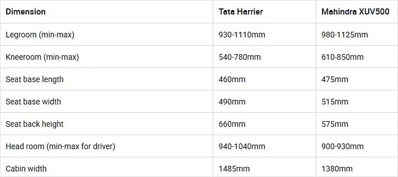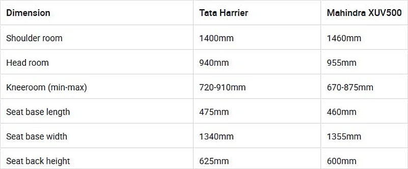 XUV500 offers more shoulder room and seat base width for second-row passengers although the Harrier offers more kneeroom and under-thigh support.