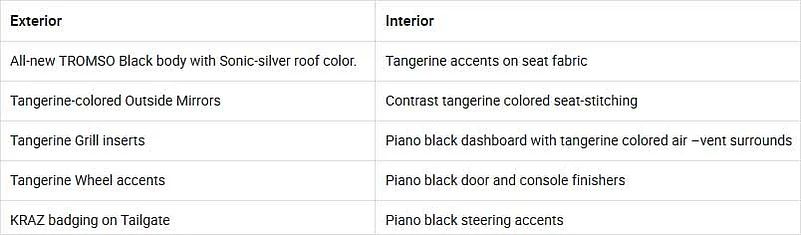 Tangerine coloured ORVMs, grille inserts and wheel accents make up the cosmetic updates on the outside. It also gets a ‘Kraz’ badge on the boot as well.