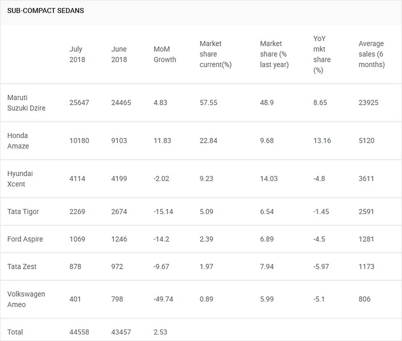1. Dzire’s dominance: The demand (from highest-selling to lowest) for sub-compact sedans remained the same in the months of June and July. And as predicted, the Dzire saw twice the demand as the car that took the second spot. The order is unlikely to change anytime soon although one of the cars in the segment -- the Ford Aspire -- is set to receive a facelift in the coming months.
