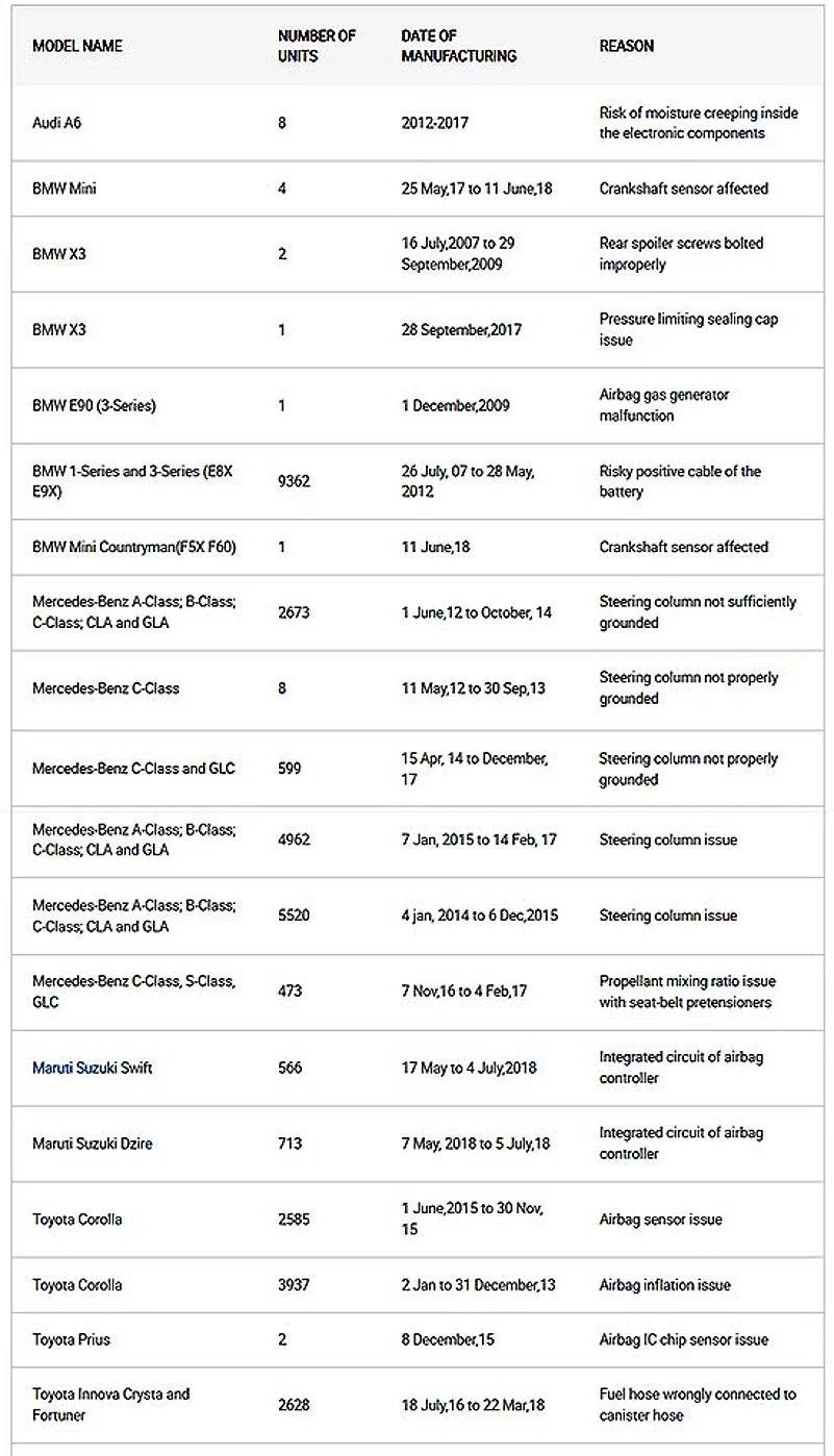 Now you know that the highest contributor to the list is Mercedes-Benz followed by BMW, Toyota and then Maruti Suzuki. Now let’s list down the manufacturer-wise models along with their reasons for recall.