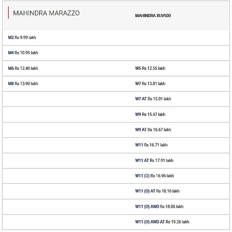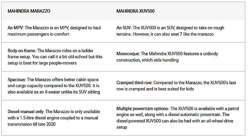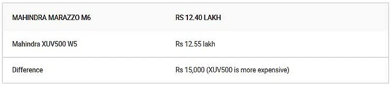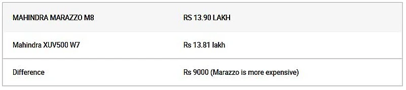Verdict The Mahindra XUV500 W7 takes the lead here as it offers better value for money of the two. In the W7 variant, the XUV5OO offers more features than the top-spec Marazzo, and that too at a lower price point. Moreover, the Marazzo’s prices are introductory and will be hiked soon.