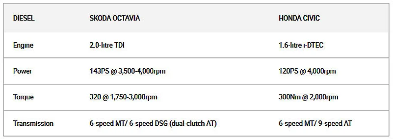Since two of the three Civic rivals in India get an automatic transmission option with a diesel engine, we think Honda would introduce the automatic transmission on the India-spec Civic as well. Check out how it will fare against the Skoda Octavia on paper.