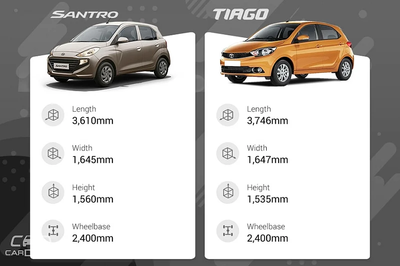 The Tata Tiago is a bit longer than the Hyundai Santro, although both cars have a similar wheelbase. So while the length of the passenger cabin might be similar, the Tiago will have a few litres of extra boot space. The Santro is taller than Tiago, by a good 25mm, which is not shocking, thanks to its tallboy design.