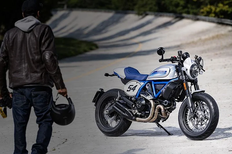 For 2019, the Scrambler Cafe Racer gets a retro silver paint job with the frame painted in a contrasting sky blue shade. The fuel tank gets painted side panels. Other retro changes include new 17-inch spoked wheels fitted with stickier Pirelli Diablo Rosso III tyres. It gets a small bikini fairing and a rear seat cowl for that sporty look. The handlebars are aluminium clip-on units with bar-mounted mirrors, while the twin stacked exhaust cans get an aluminium cover.