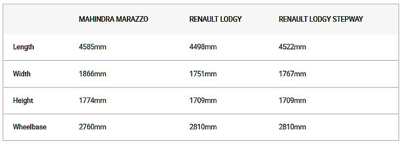 The Marazzo is longer, wider and taller than the Lodgy. However, when it comes to wheelbase, the Renault pips the Mahindra by 50mm.