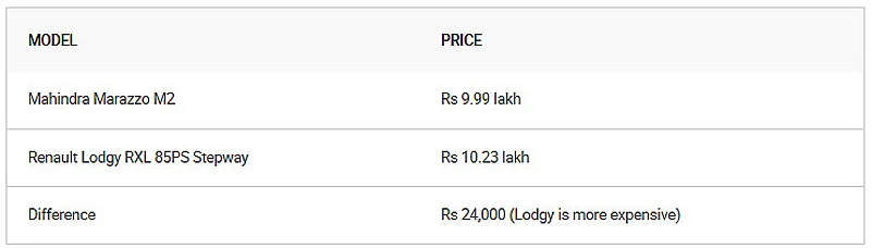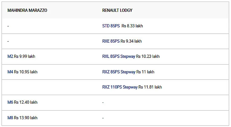 The M2 variant of the Marazzo can be pitted against the RXL 85PS Stepway variant of the Lodgy. The M4 variant of Marazzo, on the other hand, can be compared with the RXZ 85PS Stepway variant of the Lodgy.