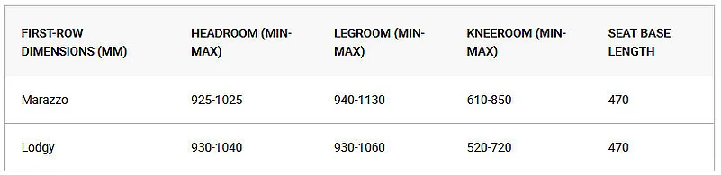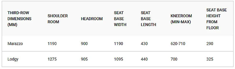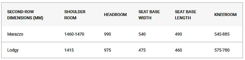 The Marazzo’s front row is overall roomier than the Lodgy with a wider cabin and more legroom and kneeroom on offer. The Lodgy does have slightly more headroom, but the Marazzo’s seats are wider and taller which make them more comfortable for those of a slightly bigger build.