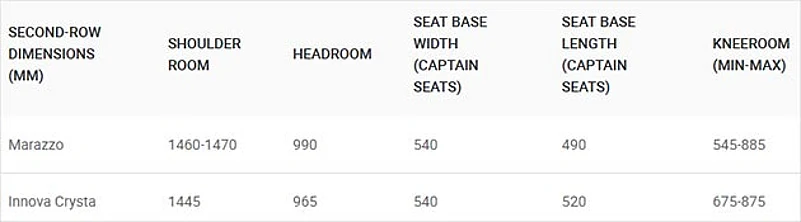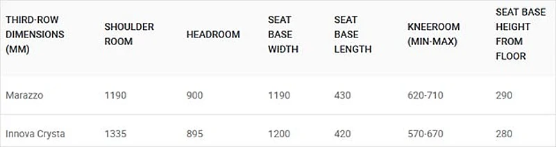 The only dimension in which the Innova Crysta beats the Marazzo is when it comes to shoulder room. So, on paper, the Innova Crysta should be able to seat three passengers more comfortably than the Marazzo. But the Marazzo could turn out to be more comfortable for two passengers in the third row.