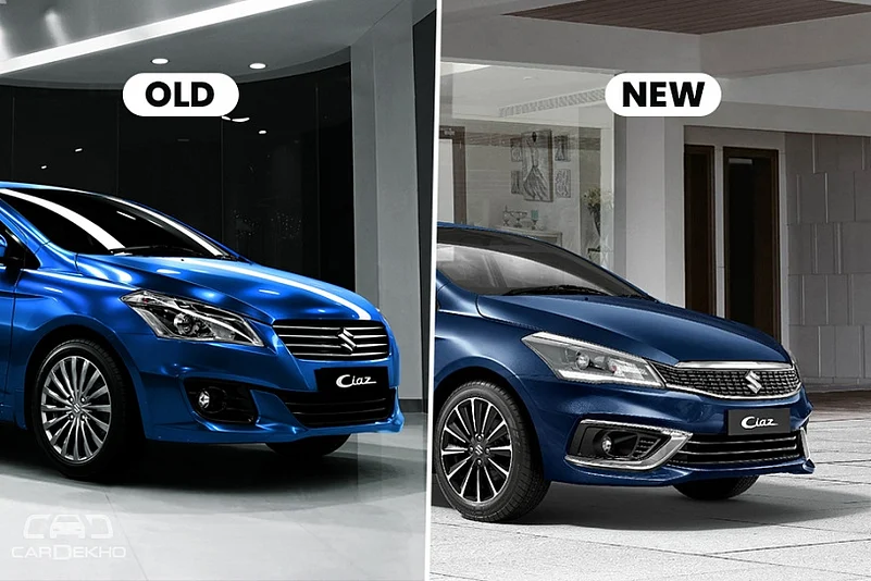 The new Maruti Ciaz looks pointier as it features an all-new front fascia. A sleeker, studded grille replaces the horizontal-slat setup found in the previous model. The slightly tweaked headlamps also feature updated detailing along with LED DRLs. The front bumper is also new and gets LED fog lamps instead of the halogen units available earlier.